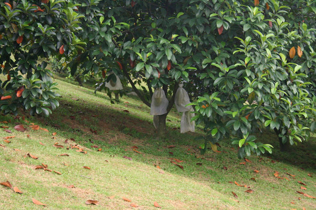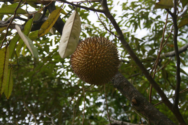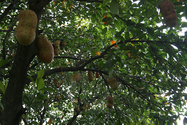 Джекфруты. Это большие такие зеленые элипсоиды. Растут они на деревьях. Вообще часто малайцы все плоды оборачивают полиэтиленовым пакетом то ли от паразитов то ли еще от чего. И поэтому, например, дерево с джекфрутами выглядит так.